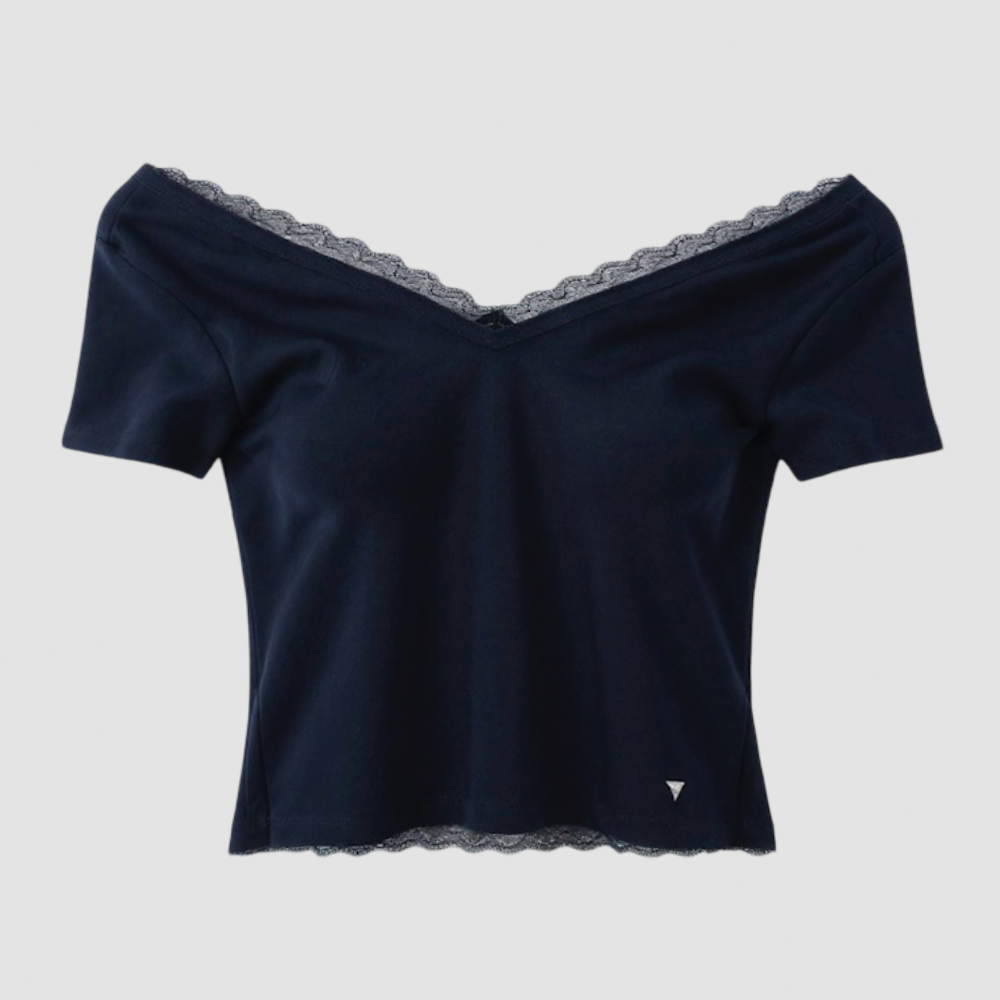 Polera, Manga corta, Mujer, Guess, Negro, Escote redondo con encaje, XL, AYA Moda Circular