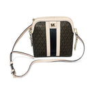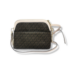 DETALLES TELA: MK en cafe, cadena dorada en cierre, correa cafe