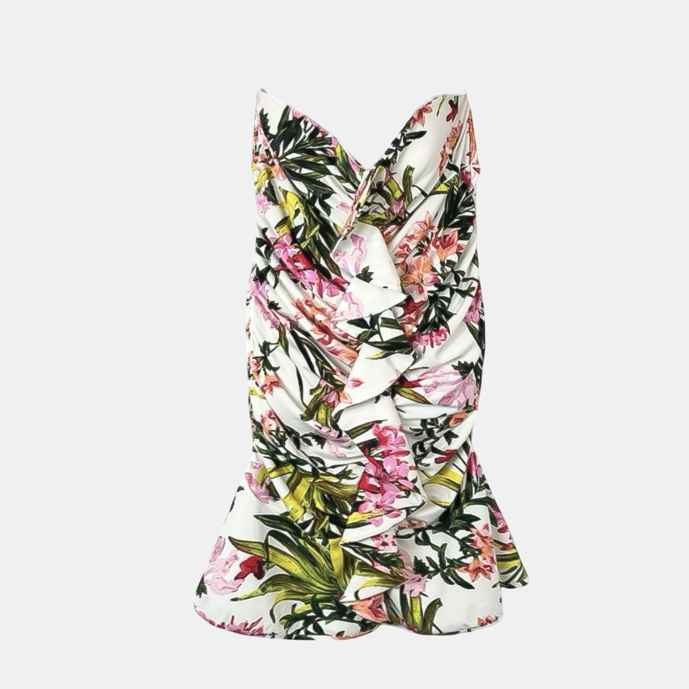 DETALLES TELA: lycra, floreado rosa y verde, drapeado, strapless