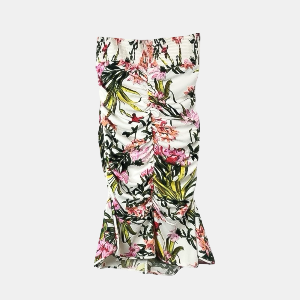 Vestido, midi, Mujer, Morgan, Blanco, lycra, floreado rosa y verde, drapeado, strapless, L, Chispa